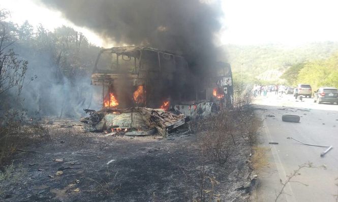 Согласно сообщению, двухэтажный пассажирский автобус столкнулся на трассе с грузовиком, после чего загорелся.