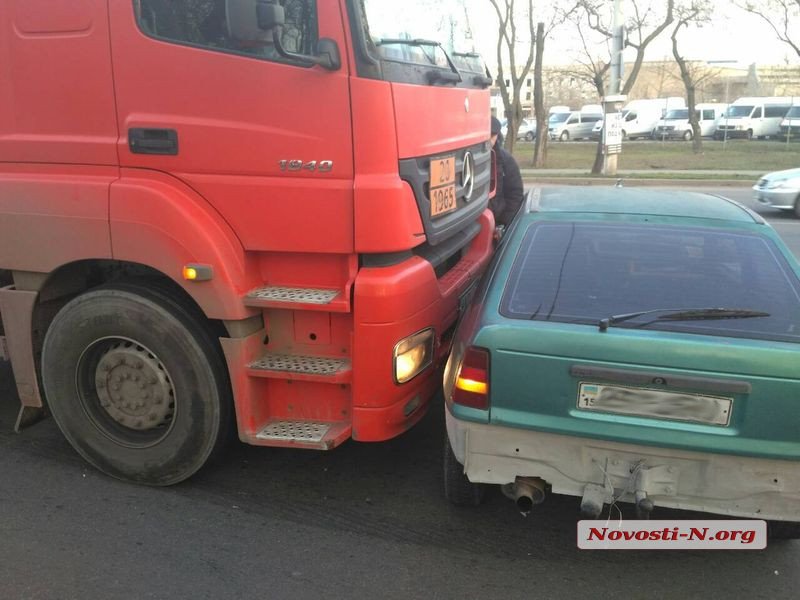 Днем в субботу, 13 января, на проспекте Героев Украины в Николаеве столкнулись седельный тягач Mercedes с цистерной газа на полуприцепе и легковой автомобиль Opel Kadett.