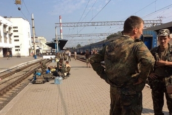 Группа военнослужащих вместе с техникой находится на платформах запорожского железнодорожного вокзала. Солдаты пробыли в зоне АТО около 3 месяцев. На прошлой неделе им удалось с боями выбраться из так называемого «южного котла», где они пробыли в окружении более месяца.