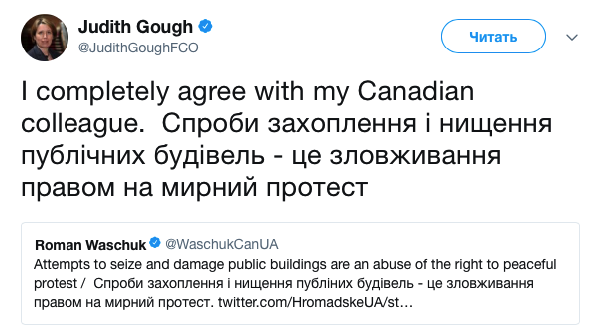 Глава канадской дипломатической миссии Роман Ващук заявил, что протестующие "злоупотребили правом на мирный протест".