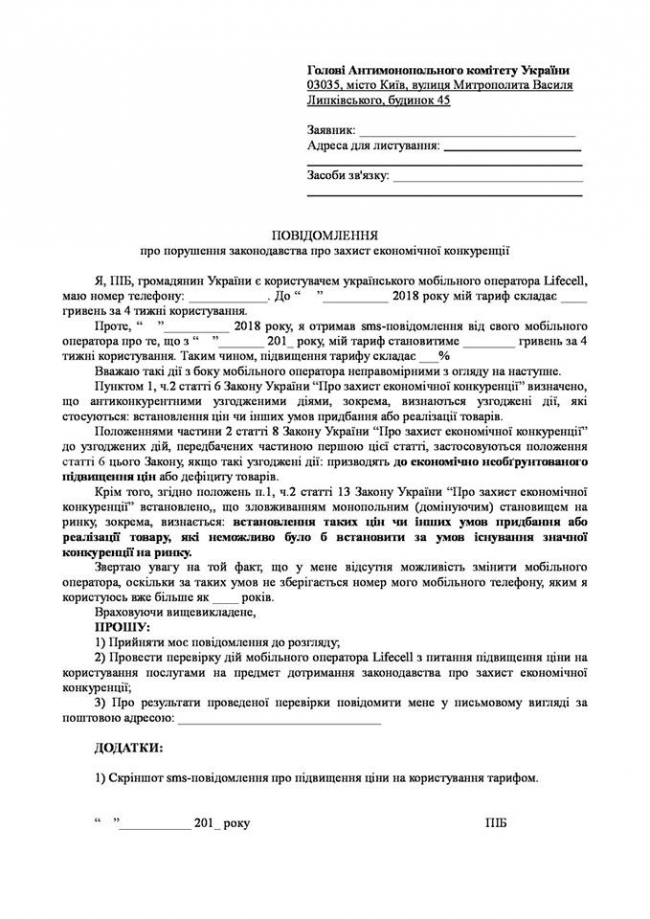 На своей странице Максим Несмиянов опубликовал образец заявления, как написать жалобу в Антимонопольный комитет Украины на резкое повышение тарифов оператором «Лайфселл» (или другими участниками рынка).