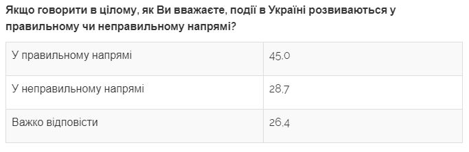 По данным опроса, проведенного в начале октября, 45% респондентов считают, что события в Украине развиваются в правильном направлении (в сентябре 2019 года так считали 57%), 29% украинцев думают, что события развиваются в неправильном направлении (в сентябре таких было 17%).