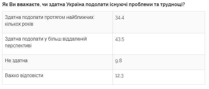При этом, 34% респондентов придерживаются мнения, что Украина способна преодолеть существующие проблемы и трудности в течение ближайших нескольких лет (в сентябре таких было 41%), а 43,5% граждан считают, что Украина способна преодолеть их в более отдаленной перспективе (в сентябре так думало 40%).