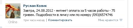 Завтра, 24 августа, на праздничный митинг-концерт, который устраивает Партия регионов, собирают людей за деньги. Платить обещают не много, как по столичным меркам, всего-то 75-80 гривен за 6 часов работы. Об этом НикВестям стало известно из массово разосланного сообщения одного из пользователей соцсети ВКонтакте.