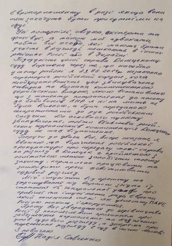 — Прошу вас обратиться к руководству России с настоятельной просьбой об обеспечении нормальных и безопасных условий судебного разбирательства, а в частности о переносе рассмотрения в суд в городе Москва, — попросила Савченко.