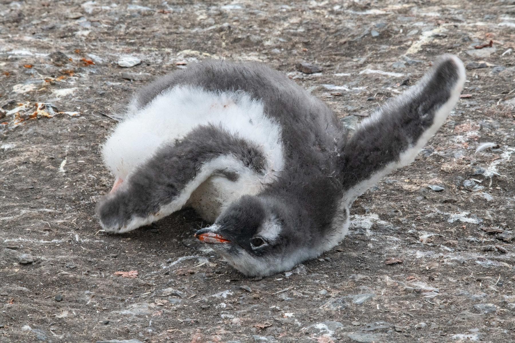 Недавно вылупившийся птенец субантарктичесокго пингвина еще плохо ходит