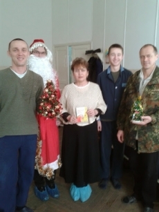С подарками участники акции направились в хирургическое и терапевтическое отделения. Вера Марущак дарила каждому бойцу открытку с пожеланиями на следующий год и вручала книги, среди которых и ее новый сборник «Ярмарок сміху». Книжки-разрисовки, которые изготовили студенты строительного колледжа на сказку «Хоровод звірят», подарили солдатам, у которых есть маленькие дети. А Дед Мороз, как ему и полагается, «обустраивал» палаты елками.