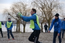 Вторая тренировка происходит в довольно необычном месте – на берегу одной из главных украинских рек – Южного Буга. Свежий речной воздух неплохо влияет на дыхательную систему спортсменов. На второй тренировке игроки МФК «Николаев» занимаются весьма полезной игровой практикой по волейбольным и регбийным правилам.
