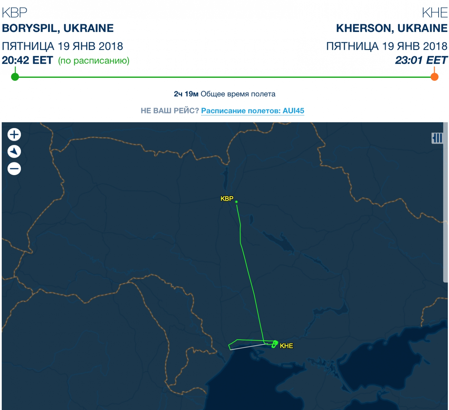 Судя по данным полета, самолет около 40 минут описывал круги над Херсоном, однако в итоге был вынужден взять курс на аэропорту Одессы, где и приземлился в 23:01.