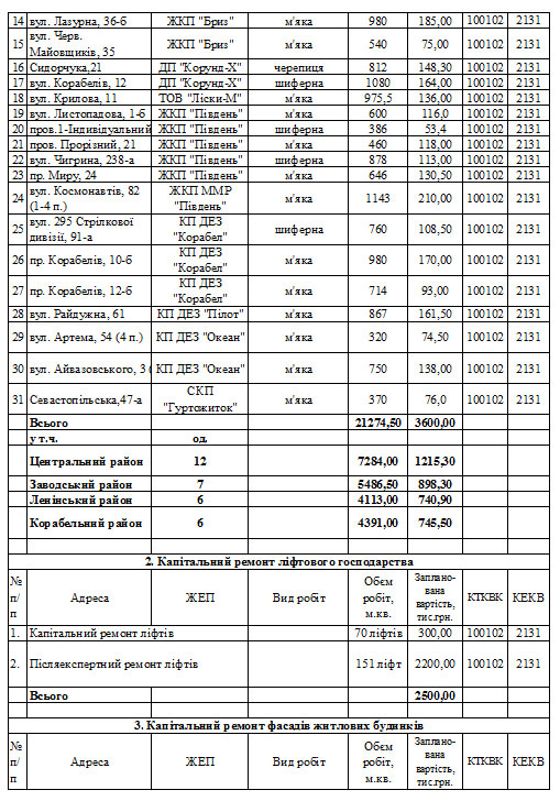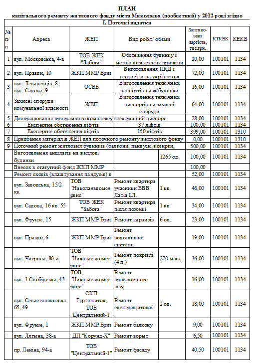Департамент жилищно-коммунального хозяйства Николаевского городского совета предоставил для ознакомления план пообъектного капитального ремонта жилищного фонда города Николаева в 2012 году, сообщили в отделе информационного обеспечения Николаевского горисполкома.