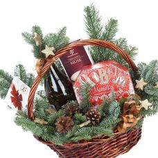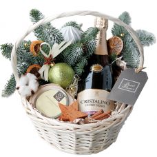 Поскольку новогодняя елка всегда пестрит яркими украшениями, букеты собирают, следуя такому же принципу. Наиболее актуальный и популярный декор - мишура, новогодние игрушки, веточки ели или сосны, шишки, свечи, имбирные пряники, мандарины, палочки корицы. Изысканно и эффектно смотрятся наборы в деревянных ящиках, плетеных корзинах.
