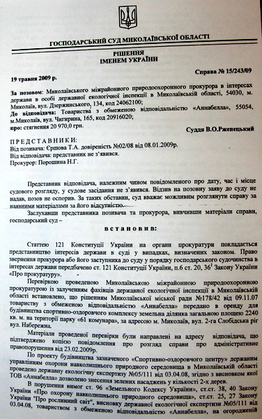 «Проверкой, проведенной Николаевской межрайонной природоохранной прокуратурой с привлечением экспертов государственной экологической инспекции Николаевской области, установлено, что решением городского совета № 178/42 от 09.11.07 ООО «Аннабелла» передали в аренду для строительства спортивно-оздоровительного комплекса земельный участок общей площадью 2240 квадратных метра на территории парка «61 коммунара», - говорится исковом заявлении Николаевской межрайонной природоохранной прокуратуры.
