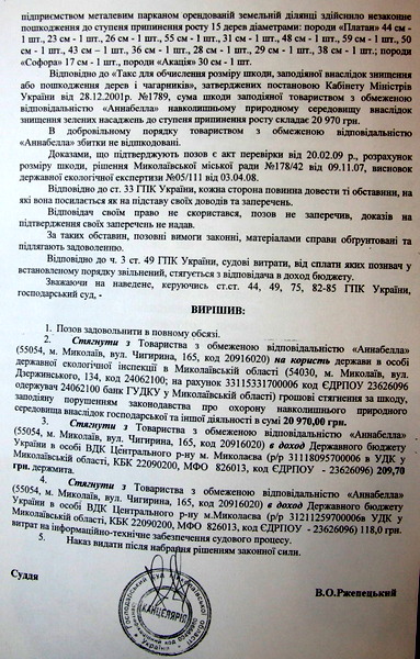 Как следствие, в соответствии с «Таксами для вычисления размеров убытков, нанесенных вследствие уничтожения или повреждения деревьев», утвержденных постановлением Кабинета Министров Украины, ООО «Аннабелла» насчитали 20 970 гривен штрафа. Кроме того, фирма в доход госбюджета должна выплатить 209,7 гривны госпошлины и 118 гривен на затраты за информационно-техническое обеспечение судебного процесса.