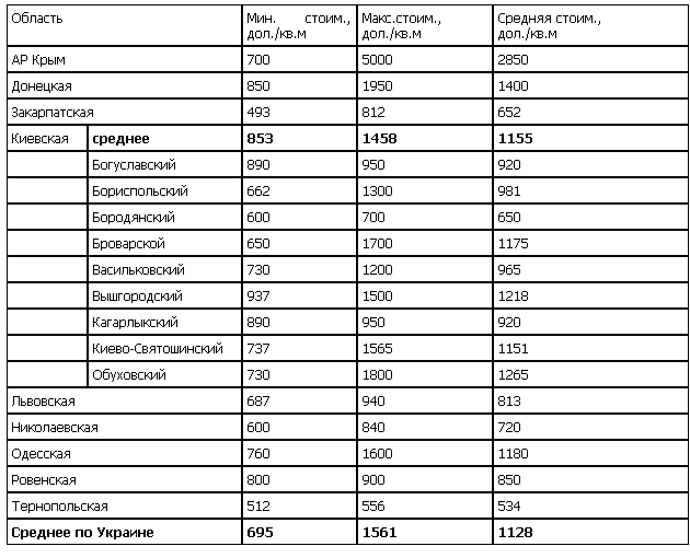 Минимальная стоимость стартует с 512 долл./кв.м в Збараже Збаражского района и достигает максимума в с. Белая Тернопольского района (556 долл./кв.м).