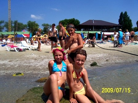 Дети фотографируются на пляже - на заднем плане в песке видно ногу слона