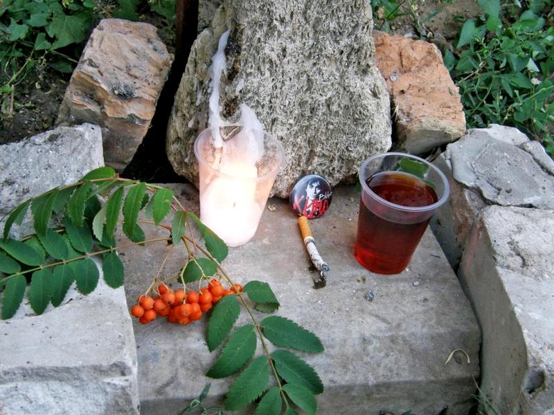 Дмитрий принес гитару, которая, впрочем, кочевала по умелым рукам ребят. В самом начале встречи, собравшиеся, на импровизированном постаменте, зажгли в память о Цое свечку, налили вино, положили зажженную сигарету.