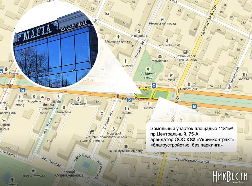 Как известно, целевое назначение этого участка — благоустройство территории без права капитальной застройки и без организации парковки автотранспорта. Эта земля находилась в аренде у компании «Укринконтракт» до 2018 года. Отметим, что разговоры о намерениях построить на данном земельном участке по проспекту Центральному, 75-А парковку или подземный паркинг ведутся уже на протяжении нескольких лет. В 2016 году Николаевский горсовет принял решение о разрешении на подготовку проекта землеустройства по объединению двух земельных участков, что может позволить изменить целевое назначение земли «под благоустройство», сделав возможным строительство там парковки.