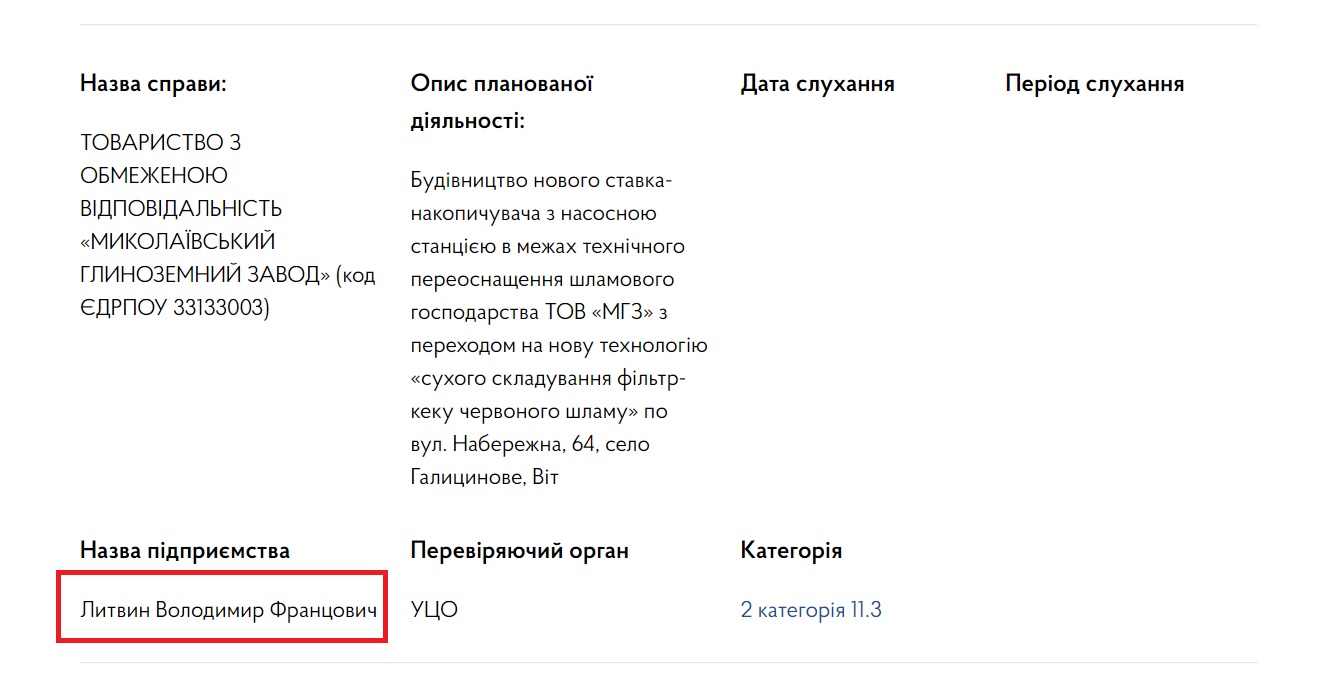Отметим, что согласно Единому реестру по оценке влияния на окружающую среду Министерства защиты окружающей среды и природных ресурсов Украины, разработкой ОВД занималось физическое лицо-предприниматель Литвин Владимир Францевич.