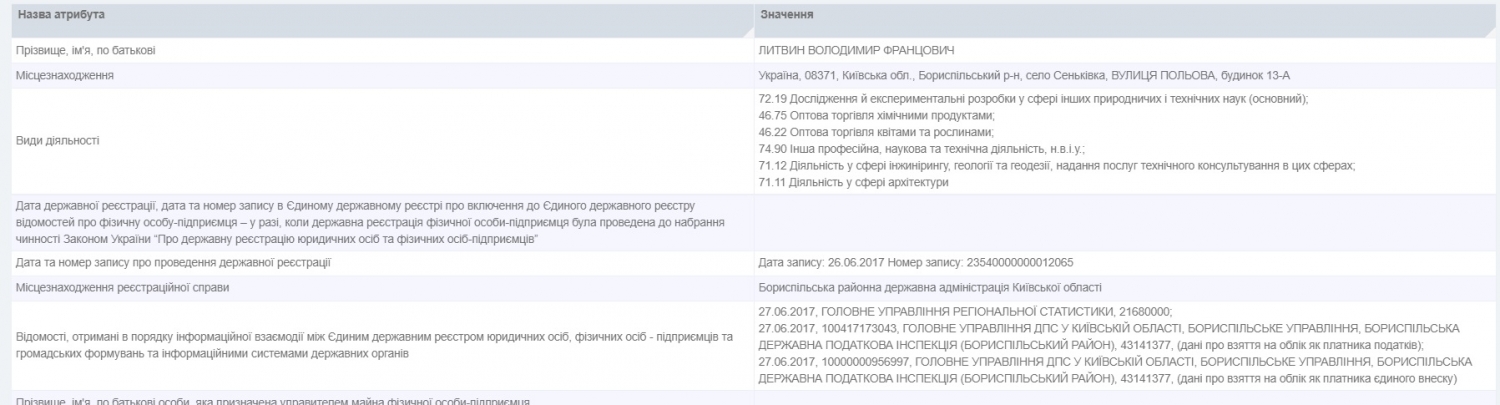 Согласно Единому реестру юридических лиц и ФЛП, предприниматель был зарегистрирован в 2017 году в селе Сеньковка Киевской области. Основным видом его деятельности являются исследования и экспериментальные разработки в сфере естественных и технических наук. Также он занимается оптовой торговлей химическими продуктами, цветами и растениями, деятельностью в сфере инжиниринга, геологии и геодезии, услуг технического консультирования в этих сферах.