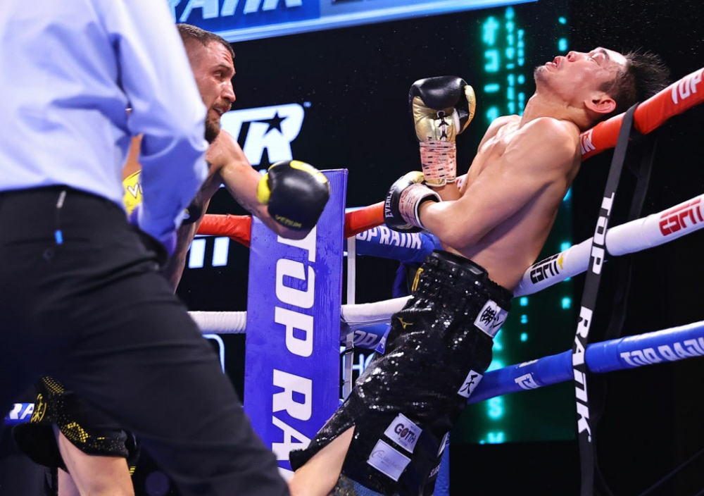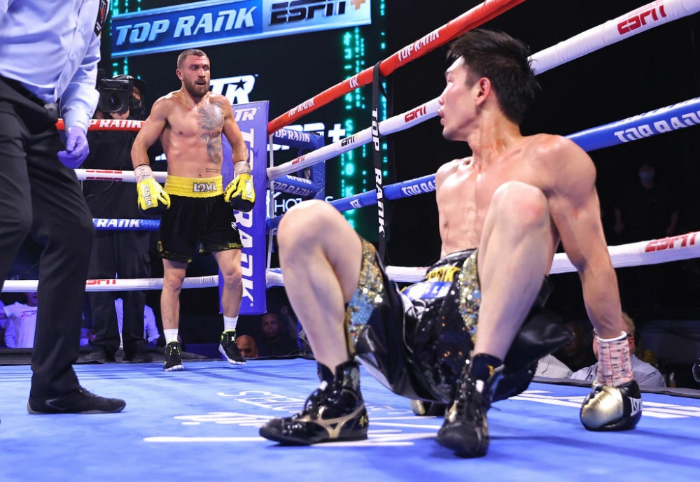 После мощной атаки Василия японец поплыл! И разорвал его Ломаченко! Рефери остановил бой и зафиксировал победу украинца. 15-й триумф украинца на профи-ринге.