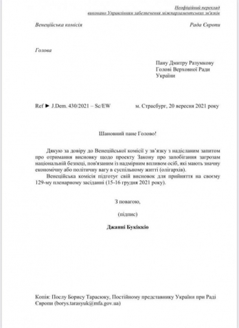 Ранее сообщалось, Венецианская комиссия даст оценку законопроекту об олигархах.