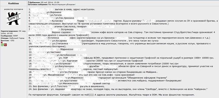 Так, на "Севастопольском политфоруме" обсуждают, кого будут убивать, публикуя фамилии и адреса "украинских активистов Севастополя".