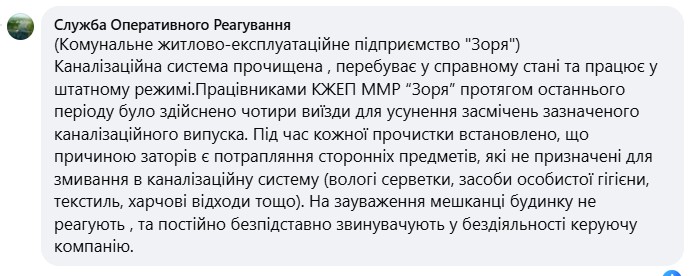 «Employees of KZEP MMZ Zoria have made four visits over the last period to clear the blockages in the specified sewer outlet. During each cleaning, it was established that the cause of the blockages was foreign objects that are not intended to be flushed into the sewer system (wet wipes, personal hygiene products, textiles, food waste, etc.),» the response states.