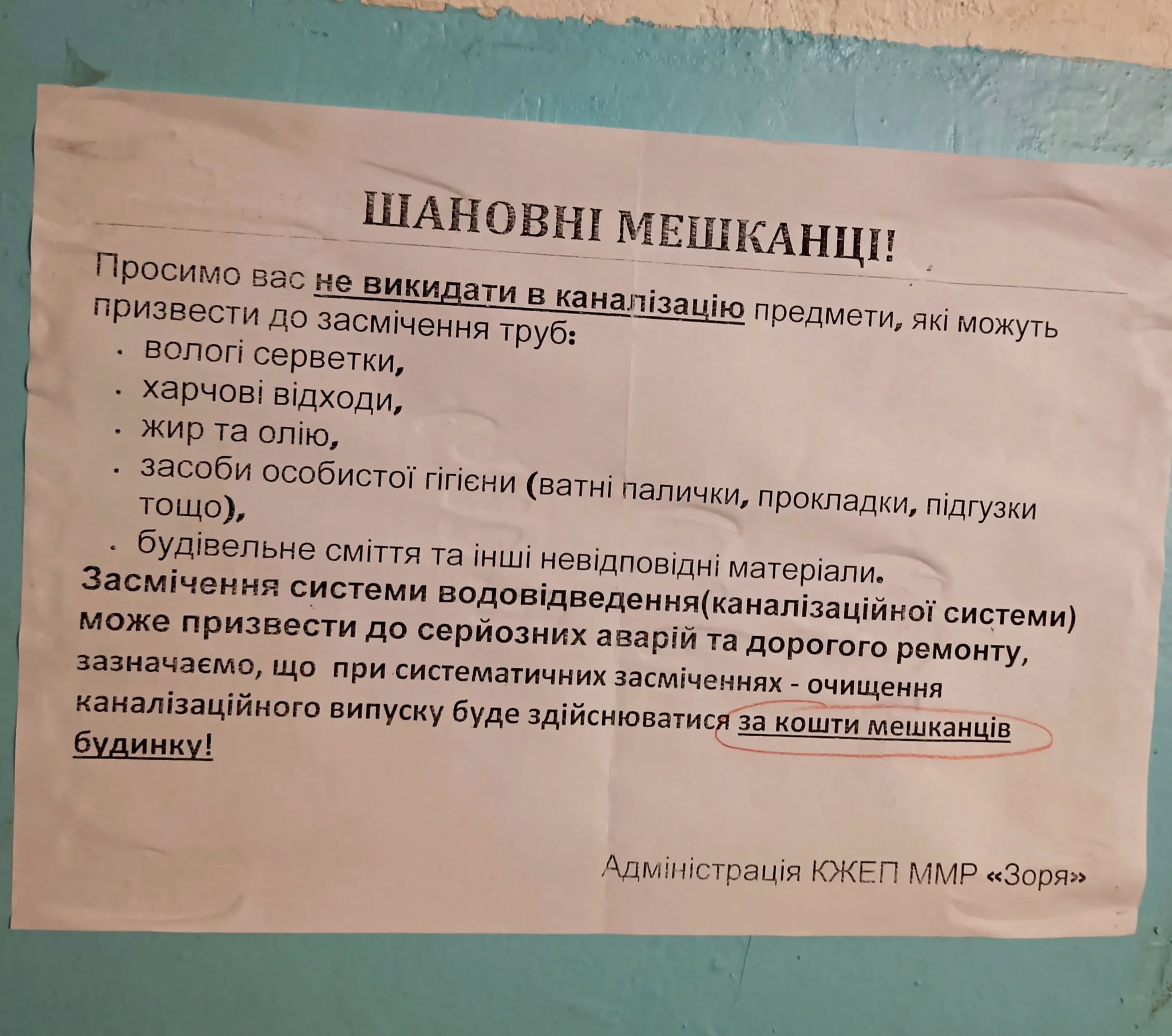 The notice that outraged people. Photo from the Facebook group Contact Centre of the Mykolaiv City Council.People are demanding a comprehensive solution to the problem. They are asking for an inspection of Zoria's activities and for the company to be obliged to carry out a full technical inspection of the sewerage system.