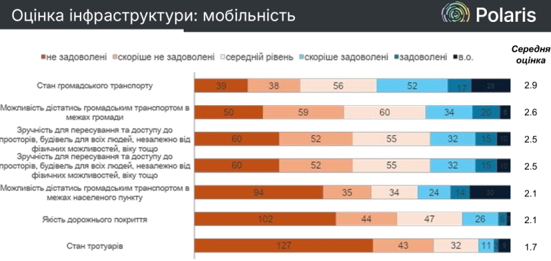 In terms of mobility, residents gave relatively positive ratings to the state of public transport and the ability to travel within the community. Accessibility and convenience of travel for people of different ages and physical abilities received average ratings.