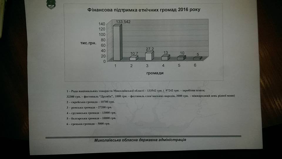 Он отметил, что Николаевский областной совет национальных общин, возглавляемый Султан-Мурадом Каймаразовым, распоряжается 70% средств, выделяемых государством. Общая сумма финансирования, по словам Анара Ахундова, составила 133 тысячи гривен.