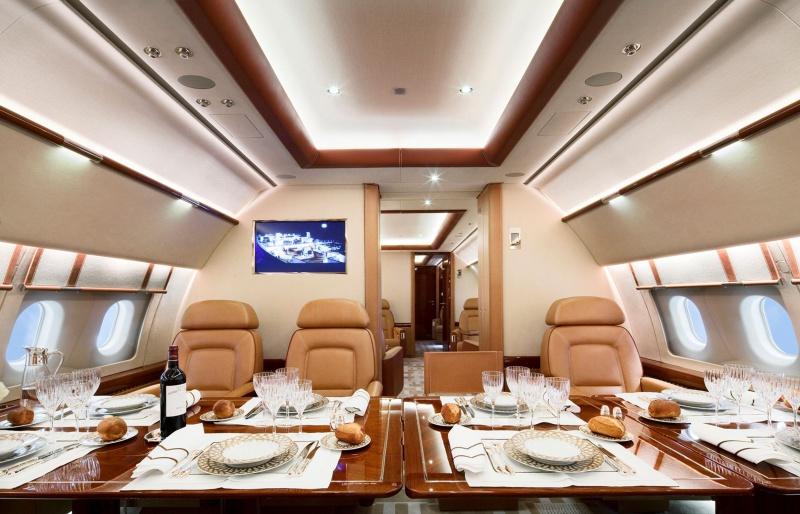 Указывается, что «в самолете были оборудованы гостиная, спальная комната, офис, ванная комната, переговорная на 12 человек с большим жидкокристаллическим дисплеем и средствами специальной связи».