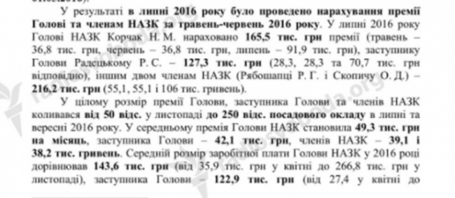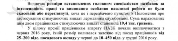 Согласно отчету, премии работникам аппарата НАПК начали выплачиваться с июня 2016 года, их размер колебался в зависимости от должностей работников - от 25-200% должностного оклада в июне до 450% - в декабре 2016 года.