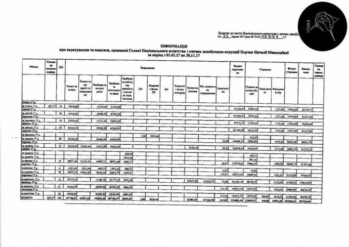 В течение января-ноября 2017 года главе Национального агентства по вопросам предотвращения коррупции Наталье Корчак насчитали 987 тысяч гривен зарплаты и надбавок с вычисленными налогами.
