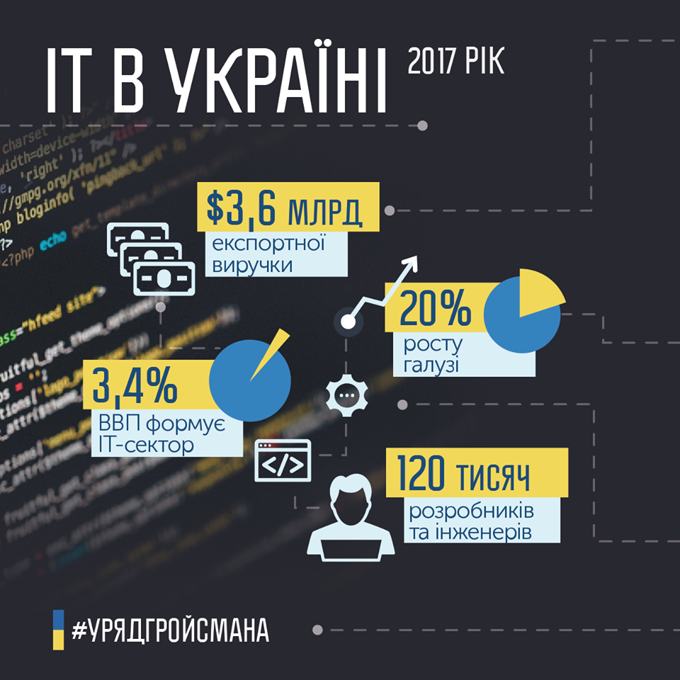 Также премьер-министр сообщил, что уже сейчас экспортная выручка IT-компаний достигает 3,6 миллиардов долларов, а IT-сектор в структуре украинского ВВП занимает 3,4%. При этом рост отрасли, по данным Гройсмана, за год составил 20%.