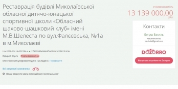 Согласно данным ресурса, КП «Дирекция по капитальному строительству и реконструкции» 16 мая обяъвило торги по реставрации здания Николаевской областной детско-юношеской спортивной школы «Областной шахматно-шашечный клуб» имени Николая Шелеста по улице Фалеевской, 1, с ожидаемой стоимостью 13 миллионов 139 тысяч гривен.