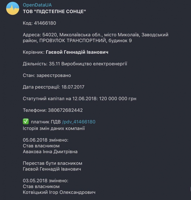 Общество с ограниченной ответственностью «Підстепне сонце» зарегистрировано в июле 2017 в Николаеве по адресу переулок Транспортный, 9 с уставным капиталом 120 миллионов гривен. Инна Авакова внесла в уставный капитал компании 35 миллионов гривен, а Игорь Котвицкий - 85 миллионов гривен.