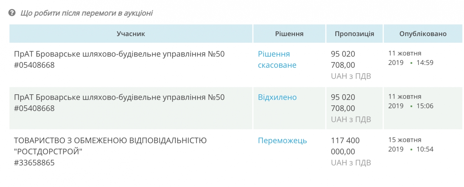 Тендер по ремонту 5 километров дороги объявили с ожидаемой стоимостью работ в 118 миллионов 775 тысяч 885 гривен. Участие в торгах приняло три предприятия, среди которых: ООО «Ростдорстрой» с предложением в 117 миллионов 400 тысяч гривен, ЧАО «Броварское дорожно-строительное управление №50» с предложением в 95 миллионов 20 тысяч 708 гривен и ОАО «Строительно-монтажный трест № 8», которое согласилось выполнить работы за 117 миллионов 580 тысяч 450 гривен.