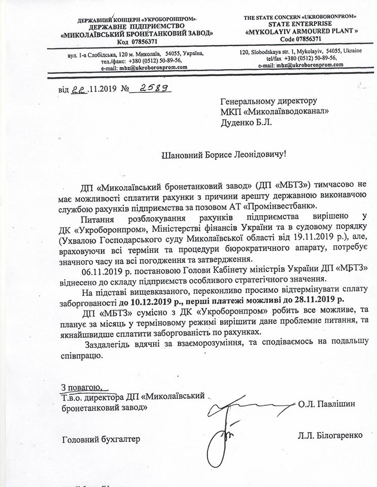 «Николаевский бронетанковый завод» в свою очередь предоставил гарантийное письмо, согласно которому обязуется за месяц в срочном порядке выплатить долг перед Водоканалом. Также предприятие просит не прекращать подачу воды, а причиной несвоевременной оплаты задолженности называет арест счетов завода по судебному иску АО «Проминвестбанка».