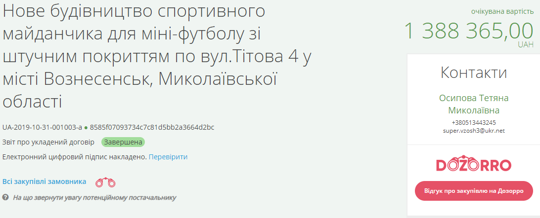 Согласно данным ресурса, чиновники 31 октября заключили договор на новое строительство спортивной площадки для мини-футбола с искусственным покрытием по улице Титова 4 в Вознесенске за 1 миллион 388 тысяч 365 гривен с новосозданным предприятием «Эльф-Спецстрой». Работы должны быть выполнены до 31 декабря 2019 года.