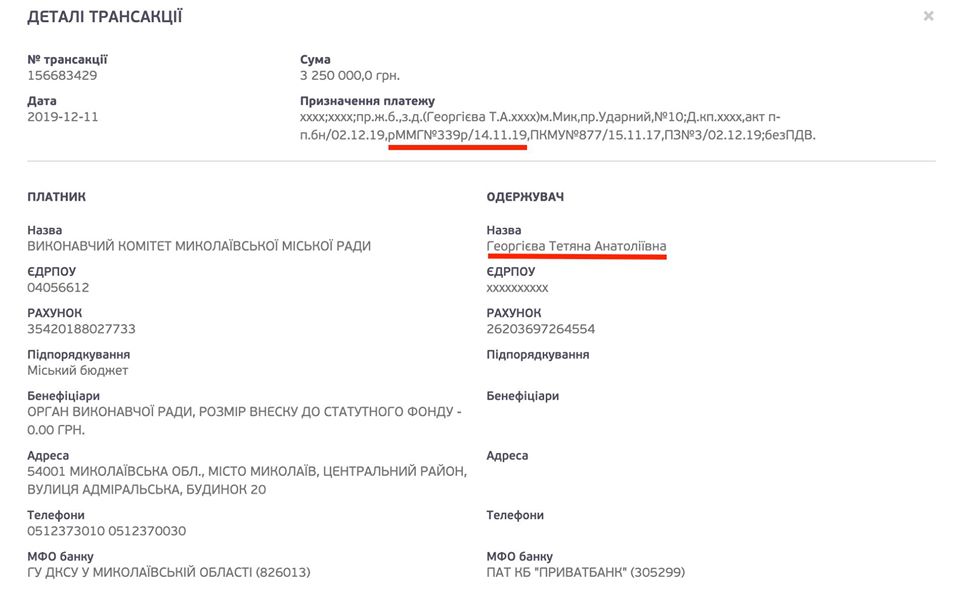 На портале использования бюджетных денег указано, что получателем средств от исполкома является Татьяна Анатольевна Георгиева. Сумма перевода составила 3 миллиона 250 тысяч гривен (что по курсу на момент продажи равно 130 тысячам долларов). Основанием для перечисления средств послужило распоряжение николаевского городского головы №339. Данный документ не опубликован на сайте Николаевского городского совета, что является нарушением законодательства.