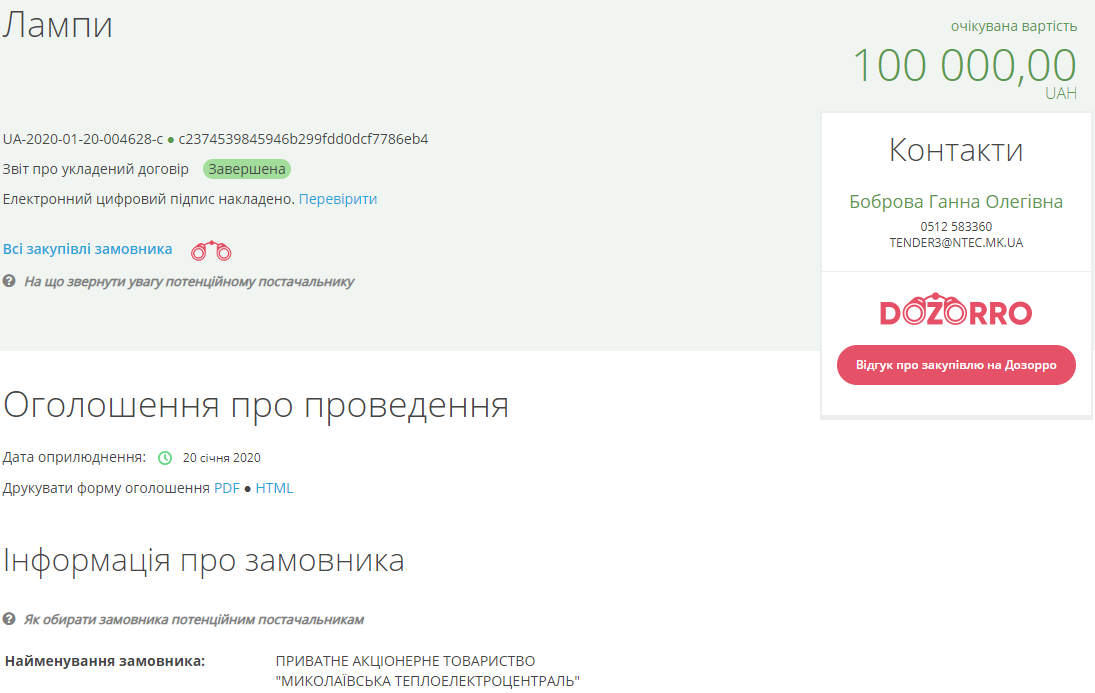 Также «Николаевская ТЭЦ» в тот же день заключила договор на покупку светильников за 175 тысяч 950 гривен с тем же предприятием.
