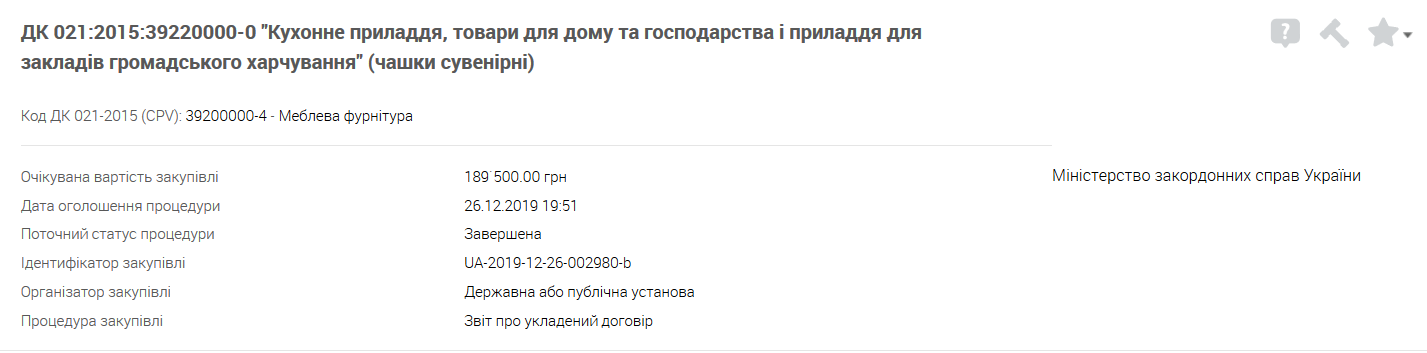 В частности, МИД приобрел у предпринимателя Игоря Стеколенко 120 сувенирных чашек за 189 500 гривен.