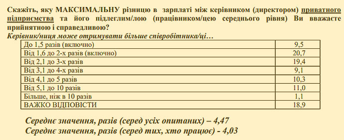 Половина украинцев считают приемлемой и справедливой максимальную разницу в зарплате между руководителем госпредприятия или учреждения и его подчиненными среднего уровня от 1,6 до 2-х раз (31,1%) и от 2,1 до 3-х раз (21,1).