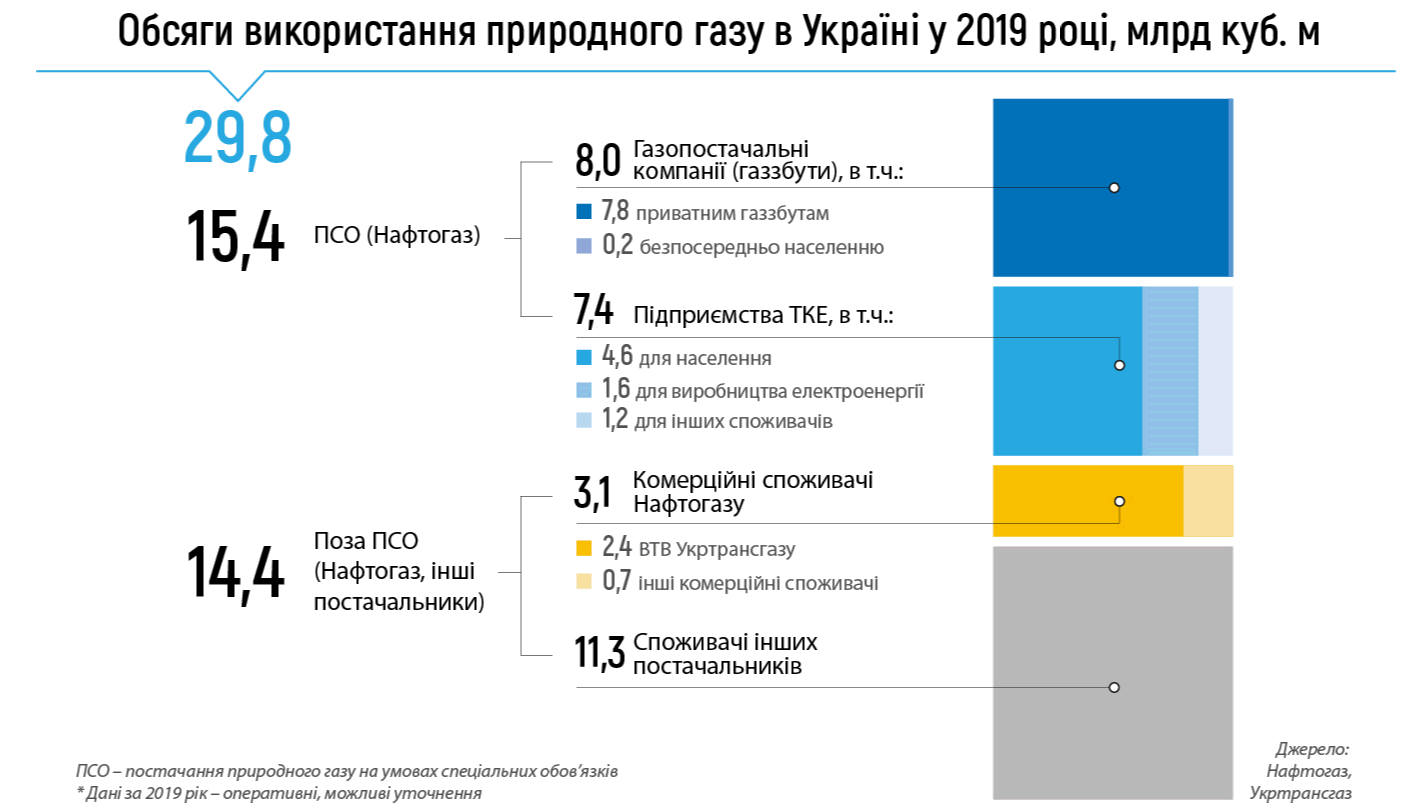 В 2019 году потребление природного газа в Украине уменьшилось на 7% — до 29,8 миллиарда кубометров с 32,3 миллиарда кубометров в 2018 году.