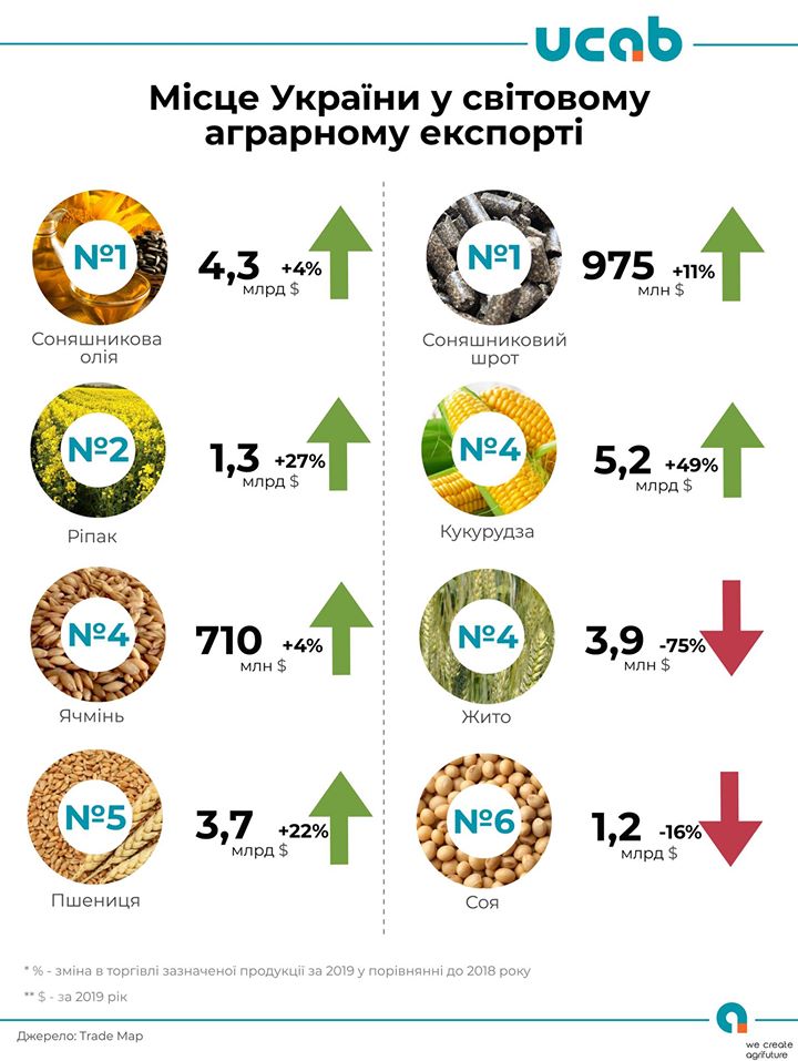Экспорт кукурузы вырос на 49% и достиг $5,2 миллиарда, ячменя - на 4% до $710 миллионов, ржи – на 75% до $3,9 миллионов, пшеницы - на 22% до $3,7 миллиардов, сои - на 16% до $1,2 миллиардов.