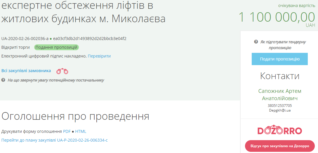 Департамент ЖКХ 26 февраля объявил тендер на экспертное обследование 302 лифтов в Николаеве за 1 миллион 100 тысяч гривен. Срок оказания услуг до 1 ноября 2020 года.
