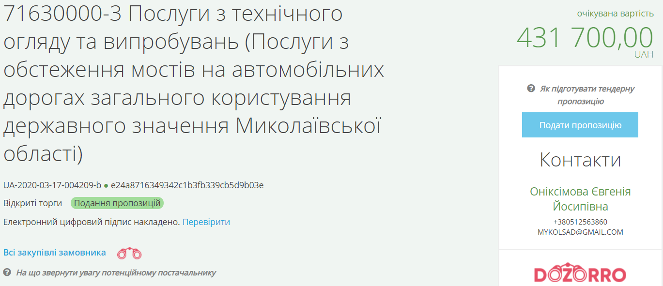 Отмечается, что подрядчик должен будет обследовать мост через ж/д на км 144 + 087 дороги государственного значения М-14 «Одесса-Мелитополь-Новоазовск (на Таганрог)»; мост через реку Южный Буг на км 108 + 814 дороги госзначения Р-55 «Одесса - Вознесенск - Новый Буг»; мост через ручей на км 131 + 513 дороги госзначения Р-55 «Одесса-Вознесенск-Новый Буг».