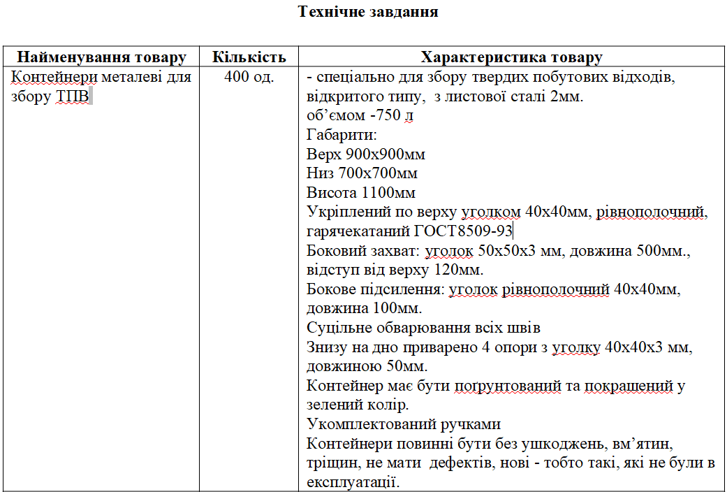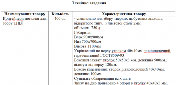 Отмечается, что контейнеры должны быть открытого типа, из листовой стали 2 мм, объемом - 750 литров, с габаритами (верх 900х900мм, низ 700х700мм, высота 1100мм), должны быть покрашены в зеленый цвет и укомплектованы ручками.