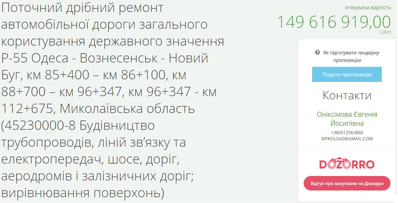 Согласно данным ресурса, САД 24 марта объявила тендер на текущий мелкий ремонт автомобильной дороги общего пользования госзначения Р-55 «Одесса — Вознесенск — Новый Буг», на участках дороги км 85 + 400 - км 86 + 100; км 88 + 700 - км 96 + 347 и км 96 + 347 - км 112 + 675 с ожидаемой стоимостью 149 миллионов 616 тысяч 919 тысяч.