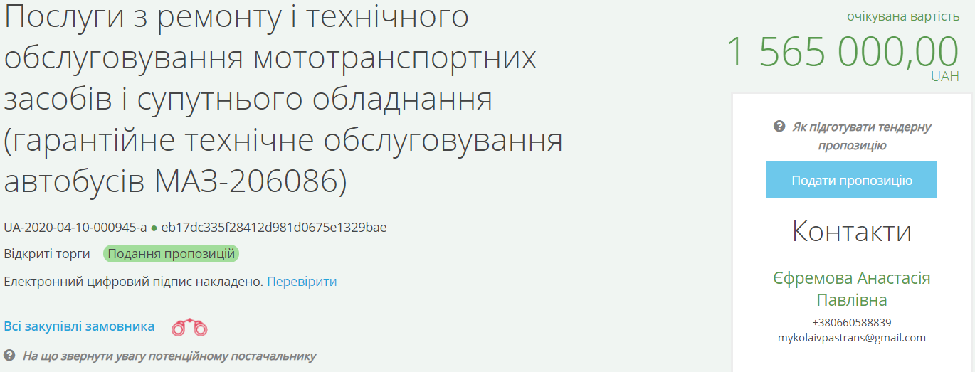 Предприятие 10 апреля объявило торги на услуги по ремонту и техническому обслуживанию мототранспортных средств и сопутствующего оборудования (гарантийное обслуживание автобусов МАЗ-206086) с ожидаемой стоимостью 1 миллион 565 тысяч гривен.